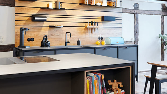 El emocionante contraste entre los modernos módulos de cocina y el entramado de madera del fondo no es exclusivo de la cocina de Jan Cray. El programa de contrastes también está a la orden del día en cuanto a materiales: Mientras que el metal pone acentos industriales, la madera aporta calidez y acogimiento a la estancia. Esta mezcla de materiales es típica de las cocinas de estilo industrial - al igual que las superficies elegantes. El metal está simplemente lacado, la madera muestra su veteado natural.